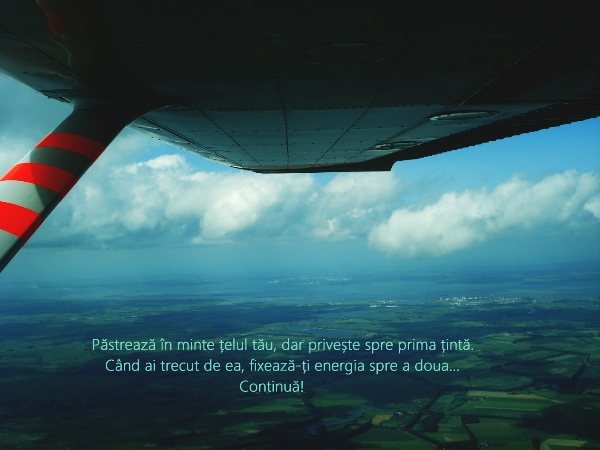 Când se ridică de la pământ cu avionul, pilotul are deja în minte locul în care vrea să ajungă. Instrumentele sunt fixate pentru locația potrivită. Norii s-au dat la o parte, iar cerul îl invită să-și continue zborul. Privirea i se ridică de la bord și privește spre cea mai îndepărtată țintă vizibilă, ca să-i fie punct de referință. Când o depășește, urmează o alta, apoi alta și alta… Până când își atinge scopul.