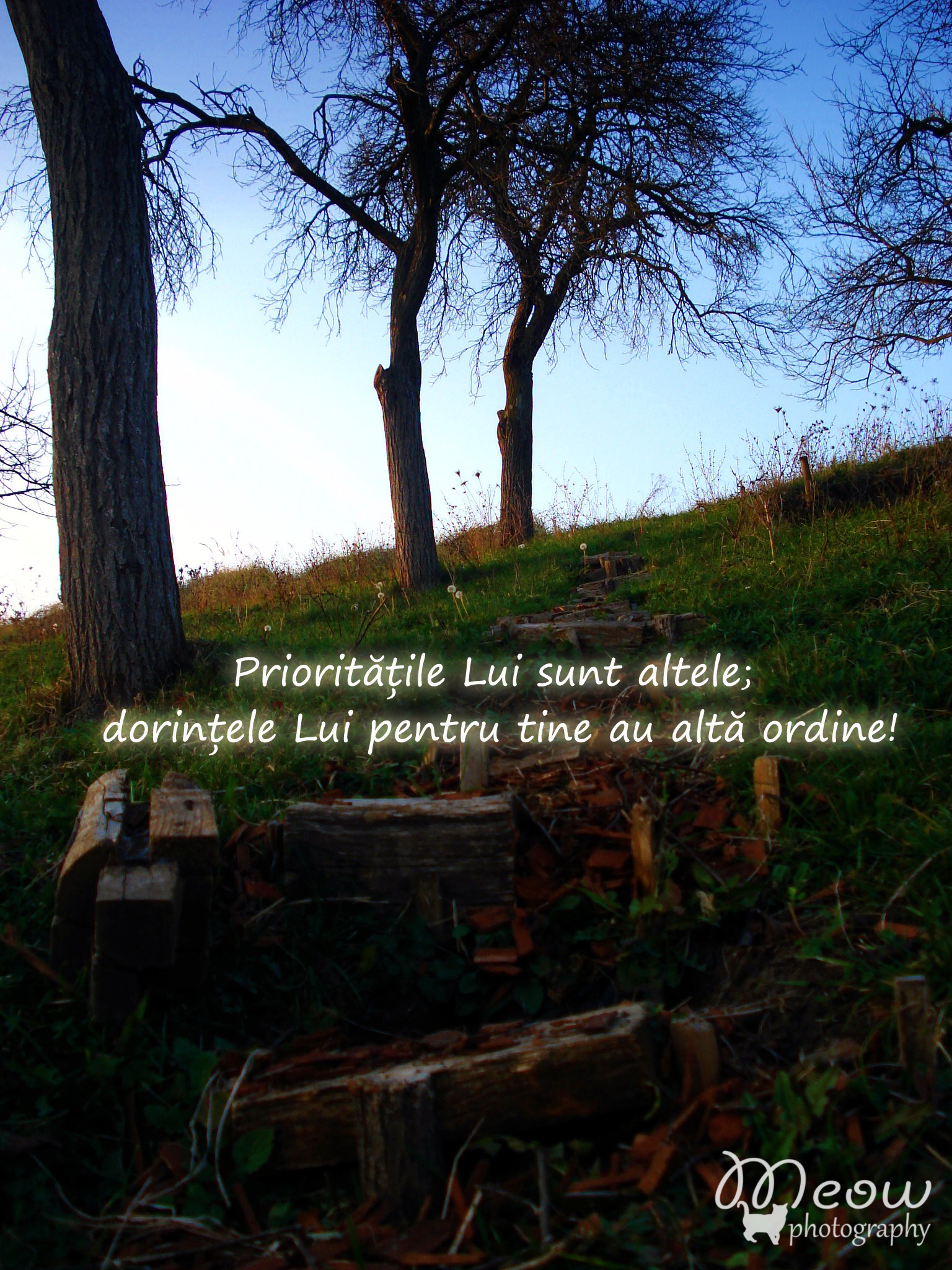 Deși m-aș putea îmbufna cu ușurință pentru că dorințele mărunte s-au realizat înaintea celor mari, tind să mă calmez. Și zâmbesc! Îmi pare că Dumnezeu încearcă să-mi transmită ceva, tocmai prin întorsăturile astea. Cumva, realizez că prioritățile Lui sunt altele; dorințele Lui pentru mine au altă ordine…