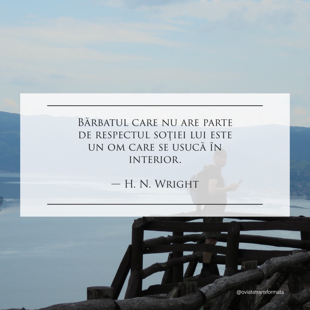 E bine cunoscut faptul că bărbatul care nu are parte de respectul soției lui este un om care se usucă în interior (după cum zice și N. Wright); dar puține femei iau aminte. Nu știu ce-i cu noi de uneori uităm ca și el este om, este frământat de griji și șlefuit de Dumnezeu, duce poveri și are nevoie de un aliat pe pământ!